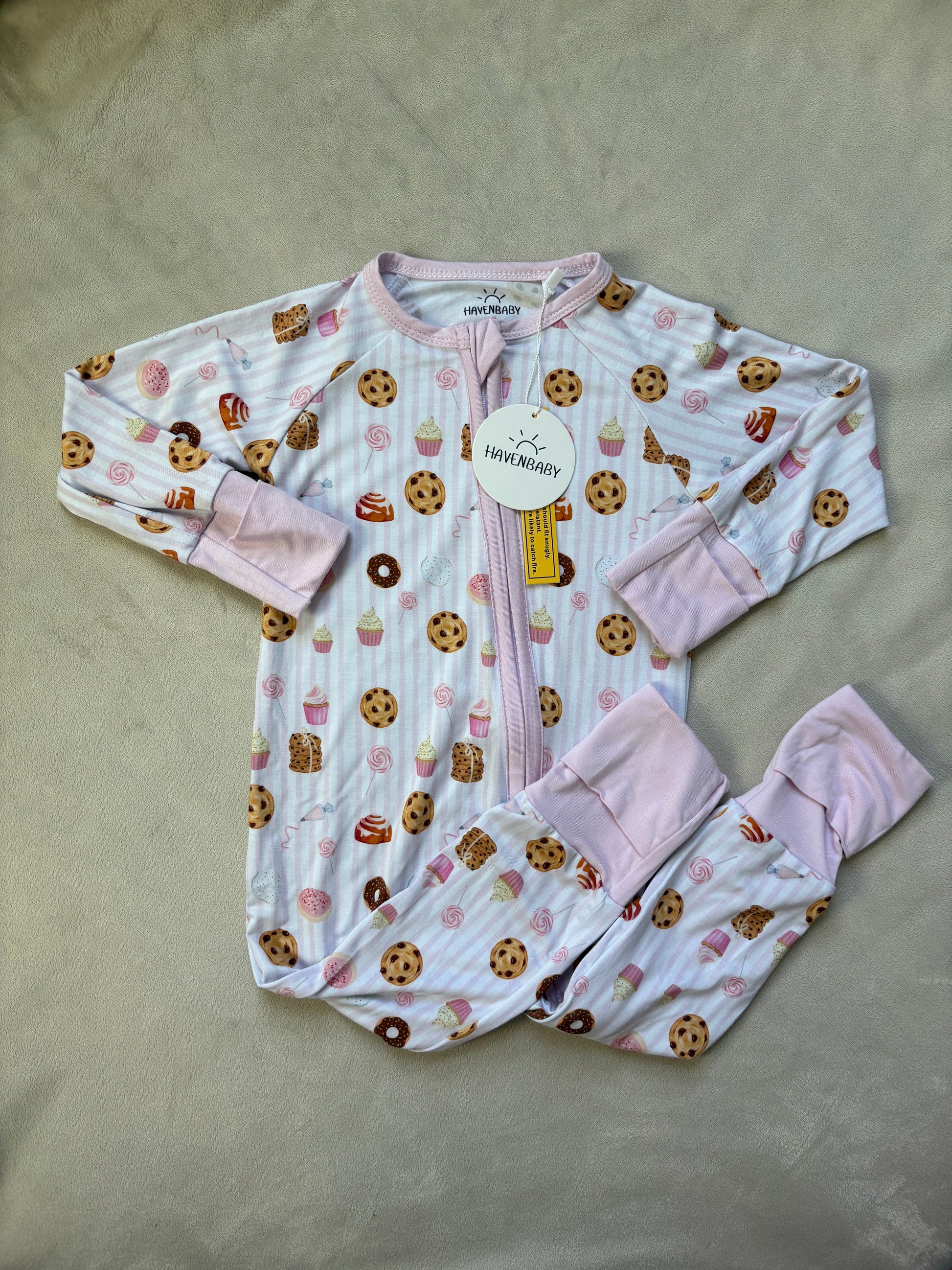 YUM! Just don't eat the baby. They will look so scrumptious in our adorable Sweet Treats Bamboo Romper. This pink stripe perfection has the yummiest treats - cookies, cinnamon rolls, doughnuts, cupcakes, icing, yum yum! This romper features our ultra soft bamboo fabric as well as: